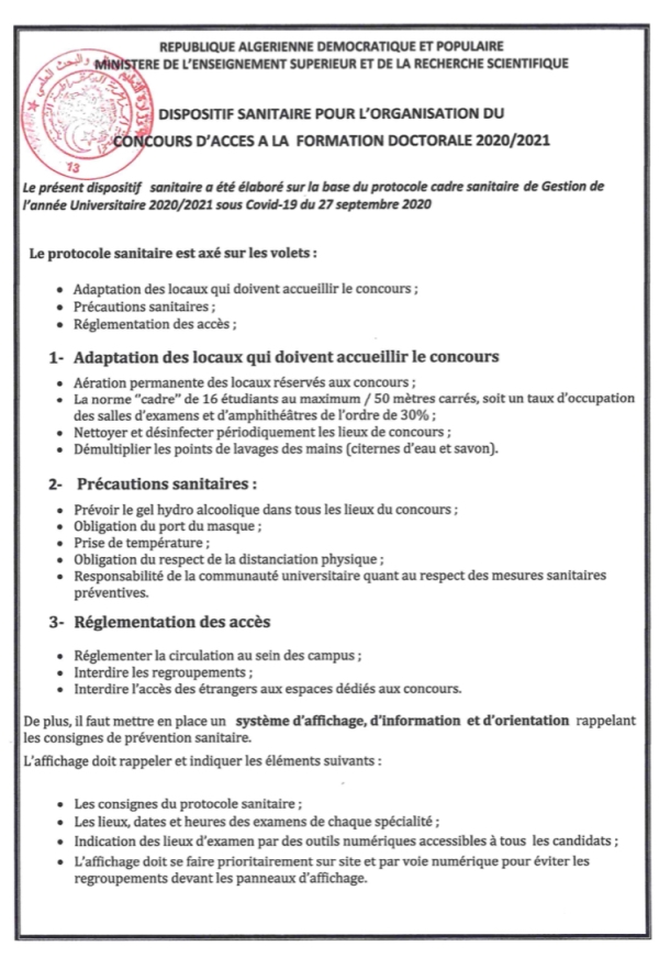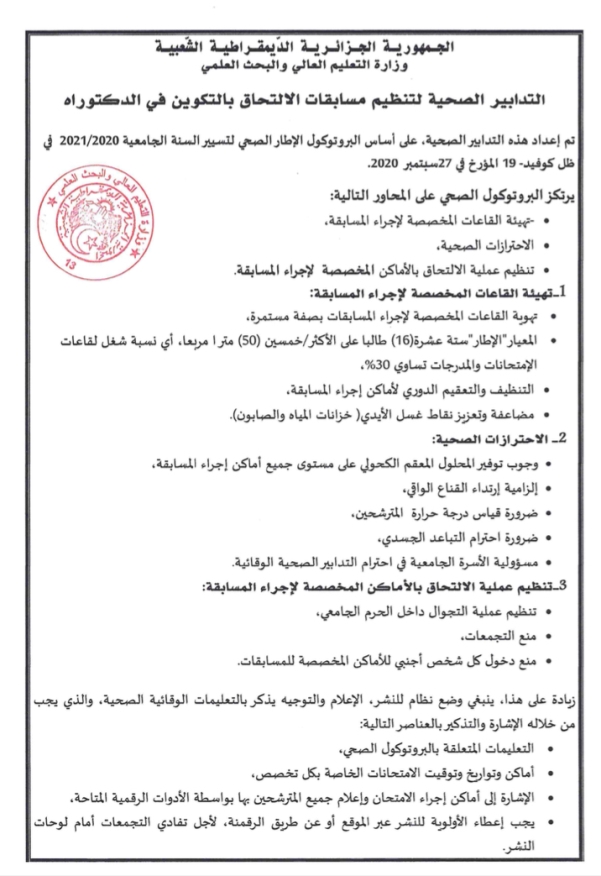 التدابير الصحية لتنظيم مسابقات الالتحاق بالتكوين في الدكتوراه 17 فبراير 2021 إعلانات الدكتوراه, مقالات مميزة 95 زيارة شاركها Facebook Twitter LinkedIn